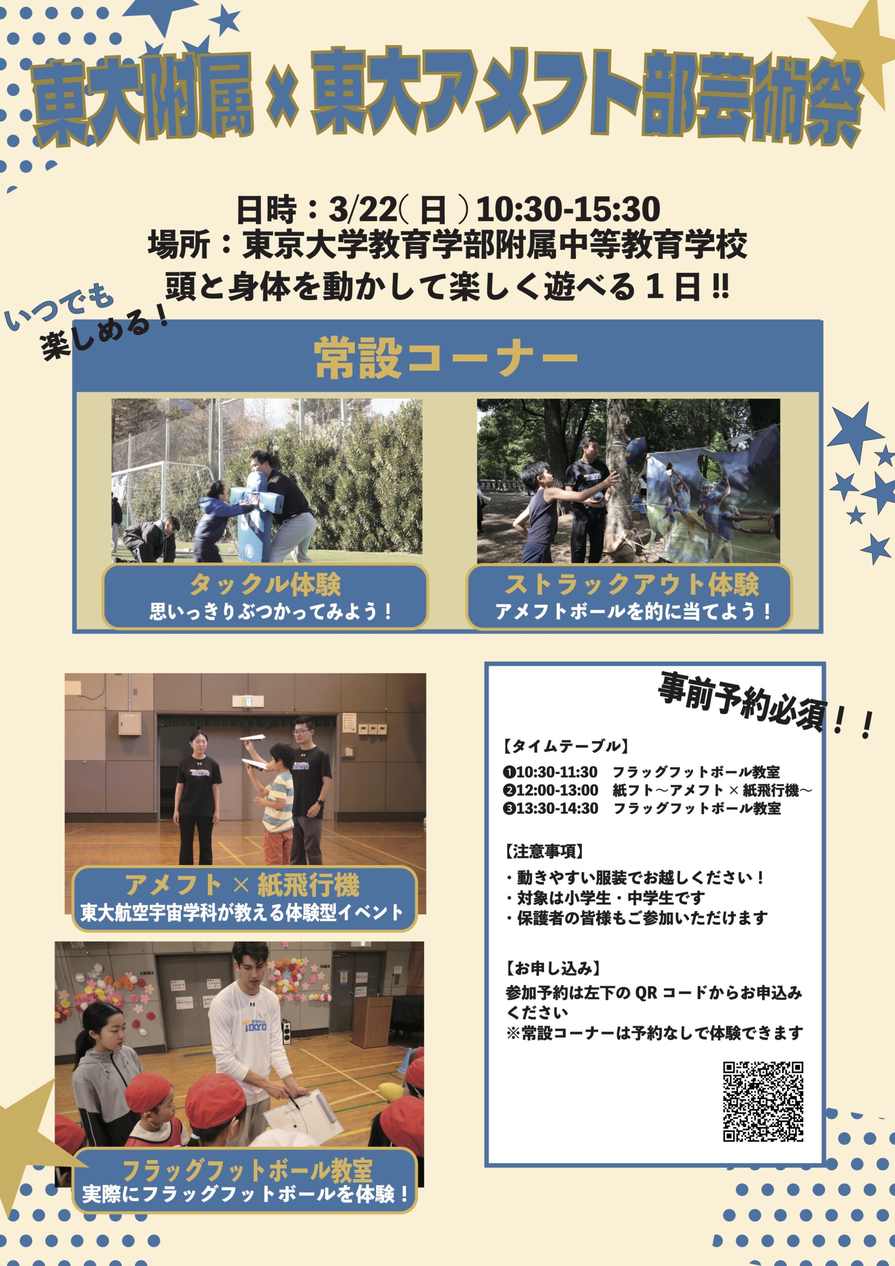 ### 開催概要 * **イベント名:** 第五回東大附属芸術祭 * **日時:** 2026年3月22日(日) * **場所:** 東京大学教育学部附属中等教育学校 * **入場料:** 無料 * **アクセス:** [東京大学教育学部附属中等教育学校の公式ウェブサイトへのリンク(交通アクセス)を掲載]